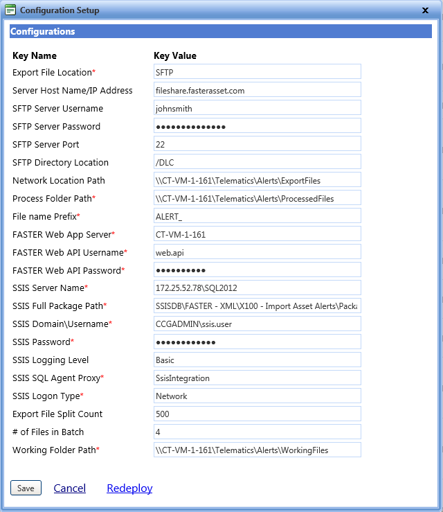 Note on Folder Paths · You must provide folder paths for the configuration of this import. It is recommended that you use a shared folder for each folder path. You must provide specific, unique values for each folder path required in the Asset Alerts Import via XML setup. · The Asset Alerts Import via XML Add-on runs on the SSIS Server, if you use a drive letter to identify any of the folder paths on the Asset Alerts Import via XML setup, the import references the folder on the SSIS Server. · The user created as per the Configuration_of_SSIS section > Create_SSIS_Admin_user_login_using_SSMS step needs to be granted Read/Write permission on the folders configured in the Asset Alerts Import via XML setup. · The Network Location Path is a required field for all Export File Location options. · All folder paths listed below must map to unique folders: o Network Path Location o Process Folder Path o Working Folder Path · To continue with this section, you must have the credentials of a FASTER Web API User. Verify FASTER Web user web.api exists with the Web Api User set to Yes. (Setup > Administrative Setup > Manage Security > Users > Add User/ View > Edit Identification.) |